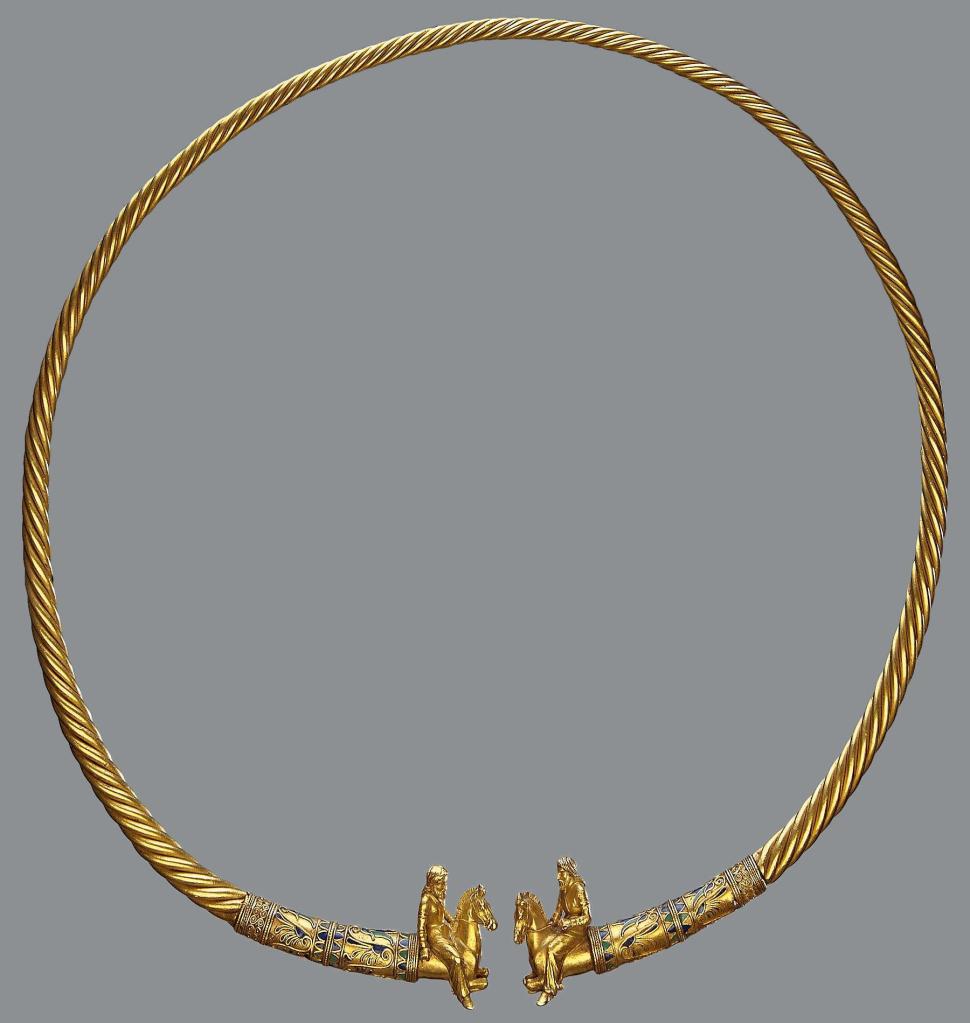 Когато първите лъчи на факлите проникнали в тъмнината на гробницата, те не осветили просто едно погребение, а нещо много по-величествено. В центъра лежал Владетелят – цар-жрец с внушителна осанка, облечен в мантията на вечността. Около шията му била увита златна торква от 461 грама, изваяна с образи на конници, които сякаш още галопирали през степта. Ръцете му, макар и докоснати от времето, сякаш стискат невидим скиптър, символ на власт, която надхвърля смъртта.