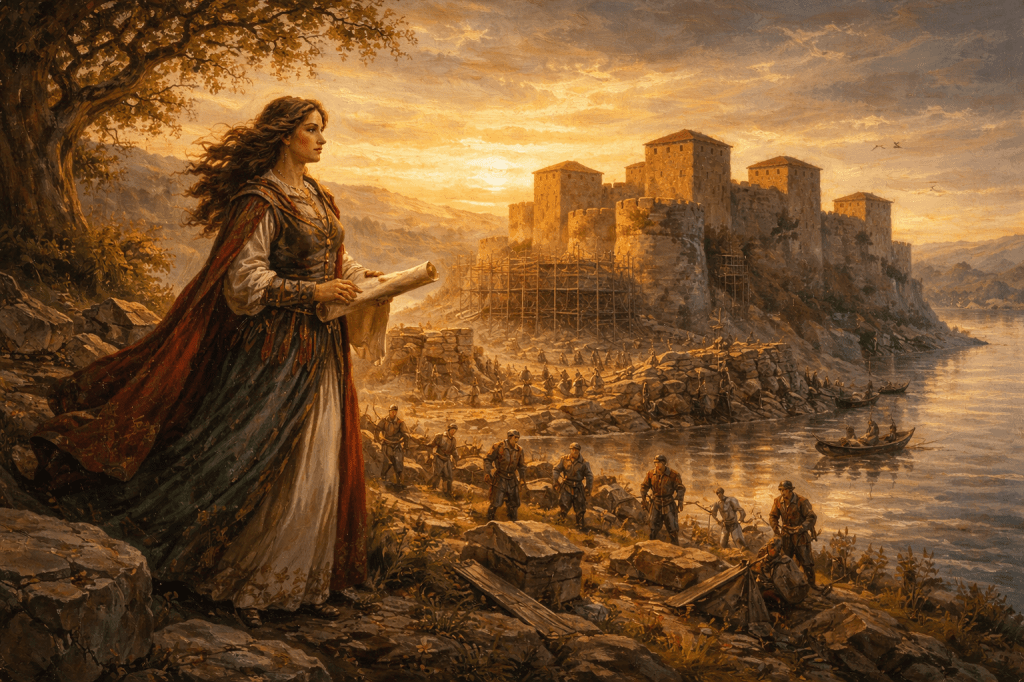 С този избор започна най-тъжната част от съдбата ѝ – градежът на крепостта. Аз бях там, в сенките, докато тя събираше майстори и работници от близо и далеч. Земята ѝ бе на брега на Дунав, стратегическо място, където реката пазеше от едната страна, а хълмовете – от другата страна. Вида заповяда да се издигне мощна крепост: стени от камък, високи кули, които да надзирават хоризонта, и порти, които да устоят на всяка обсада.