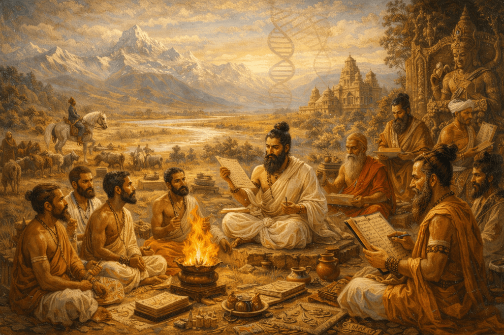 Генетиката е първият ключ: Хаплогрупата R1a-Z93, доминираща сред Брахмините (до 72%), е подгрупа на R1a, типична за балканските народи и древните българи. Тя произхожда от древните култури, свързани с древните балканци. Тези „арии“ – благородните – не са местни индийци; те са дошли от северозапад, запазили гените си чрез ендогамни бракове. Изследвания от 2010-те години, като тези на Reich Lab, потвърждават: арийската миграция носи R1a от Евразийските земи, където древните българи са част от индоевропейското семейство.